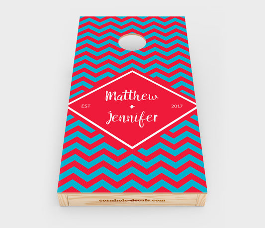 Chevron Wedding Cornhole Wrap Design – Aqua & Cherry Red